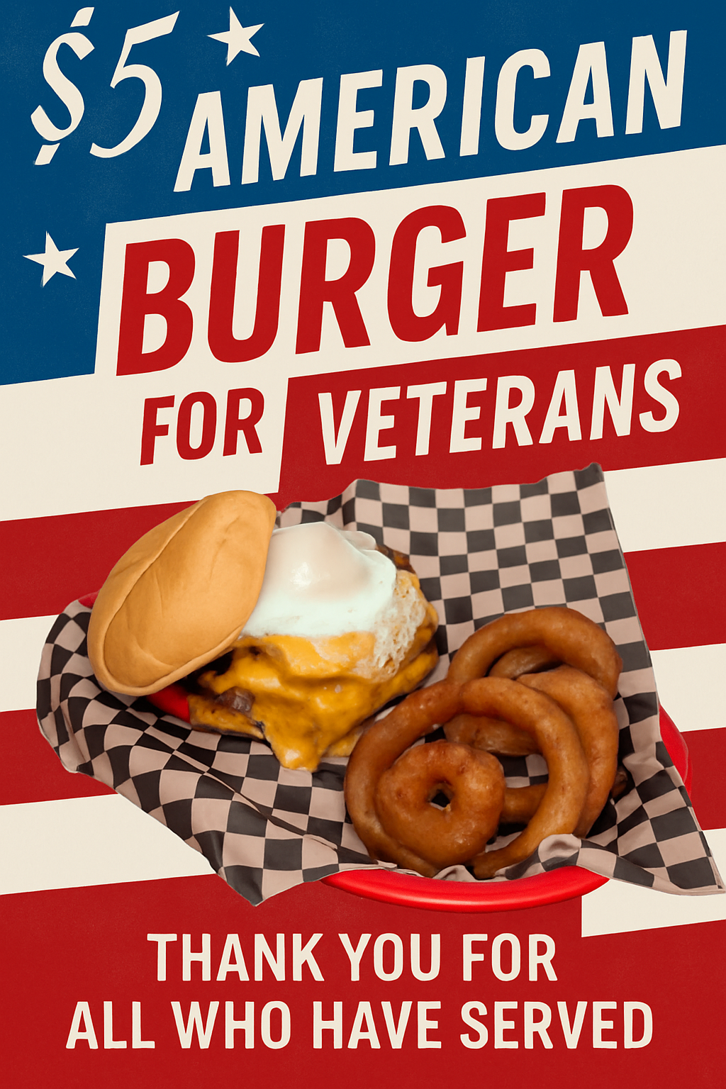 THE AMERICAN BURGER IS ONLY DURING THE FOURTH OF JULY AND VETERANS DAY JUST FOR OUR SPCECIAL VETERANS.